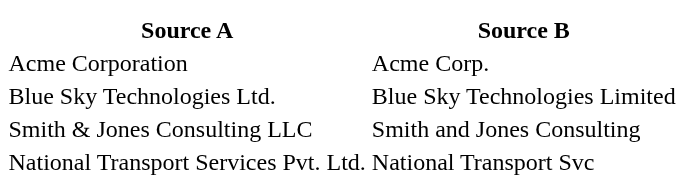 The meaningful token in every row is the company-specific name: "Acme", "Blue Sky Technologies", "Smith & Jones Consulting", "National Transport". Everything else — "Corporation", "Corp.", "Ltd.", "Limited", "LLC", "Pvt.", "Services", "Svc" — is either a legal suffix, an industry classification, or a generic word that appears in thousands of company names.