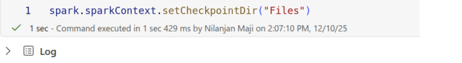 This Sets a checkpoint directory in Microsoft Fabric’s Onelake for Spark to store intermediate computation data.