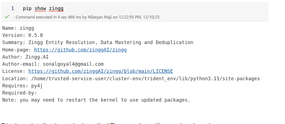 This command fetches and installs the Zingg Python library and restarts the Python kernel so that you can use an updated package.