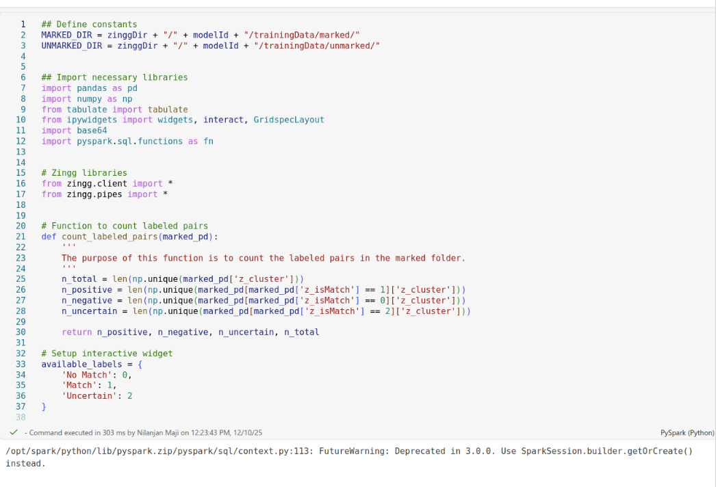 It’s a good idea to keep things neat, especially when you’re working with multiple datasets and training models. Zingg requires specific folders for its labelled and unlabelled training data. you Set up directory paths in your Notebook with this command.