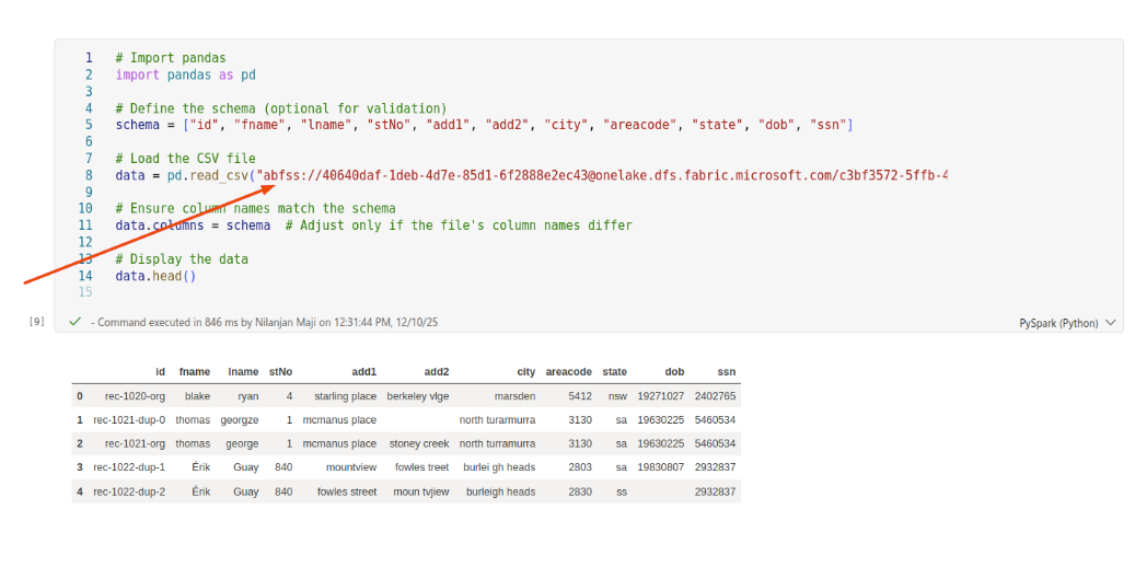 data = pd.read_csv("abfss://40640daf-1deb-4d7e-85d1-6f2888e2ec43@onelake.dfs.fabric.microsoft.com/c3bf3572-5ffb-4770-9de3-7c60cf5b91d8/Files/Test.csv",header=None)