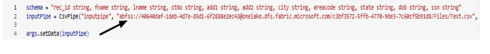 inputPipe = CsvPipe("inputpipe", "abfss://40640daf-1deb-4d7e-85d1-6f2888e2ec43@onelake.dfs.fabric.microsoft.com/c3bf3572-5ffb-4770-9de3-7c60cf5b91d8/Files/Test.csv", schema)