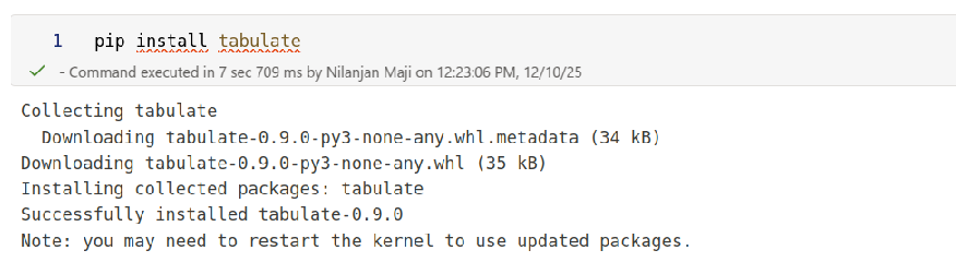 We use this command to install the required dependencies, especially tabulate andrestart the Python kernel.